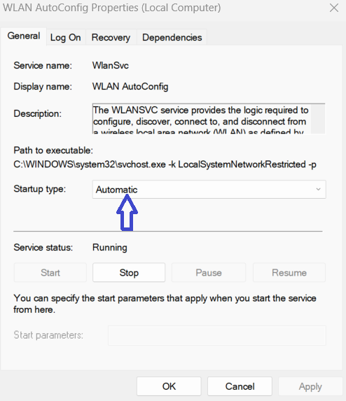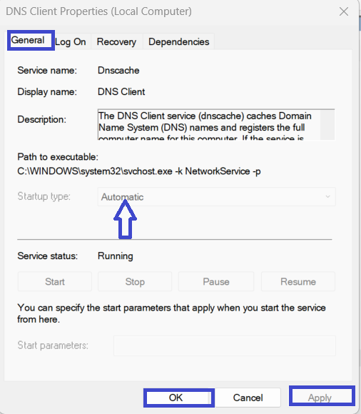 6. 單擊常規選項卡 > 將啟動類型設置為自動。