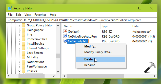 3.在 Explorer 註冊表項的右窗格中,右鍵單擊無安全選項卡命名註冊表 DWORD (REG_DWORD) 並選擇刪除。在接下來出現的確認提示中單擊“是”。