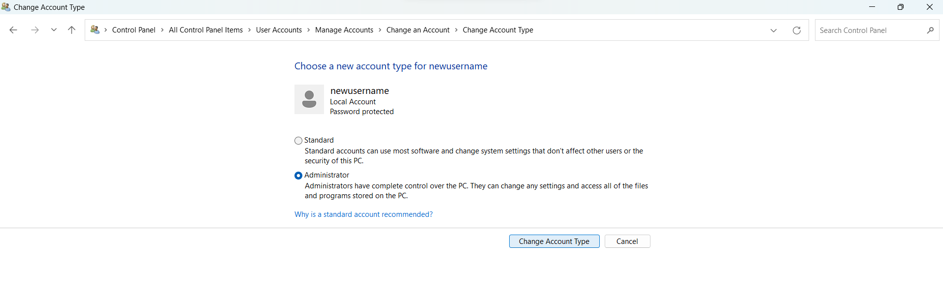 - 前往更改賬戶類型並選擇行政人員。單擊更改帳戶類型。