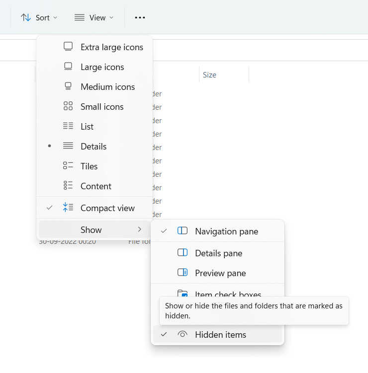 - 在此新帳戶中打開文件資源管理器並轉到系統硬盤。在這裡,點擊視圖 > 顯示 > 隱藏項目。