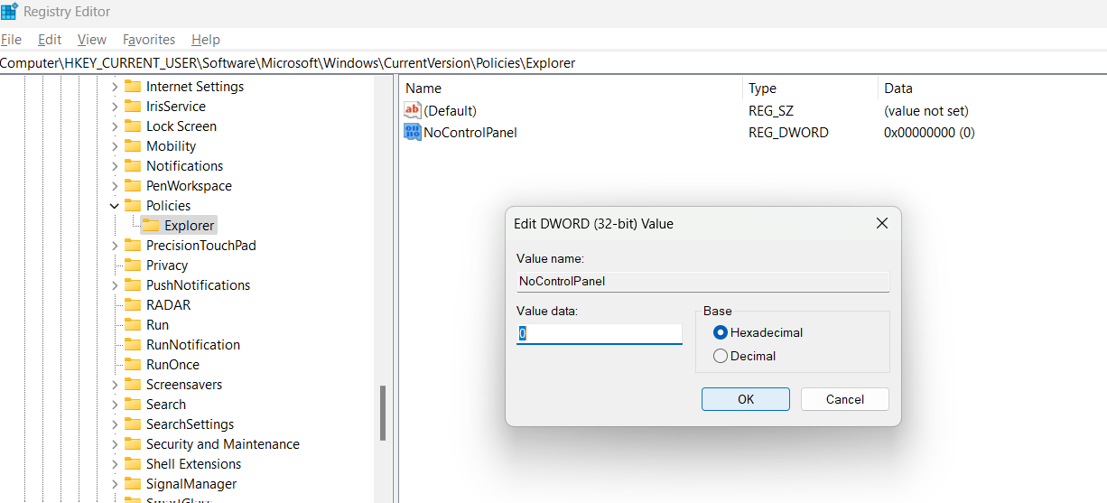 - 將此新值命名為無控制面板右鍵單擊它。雙擊這個並將其值設置為 0。