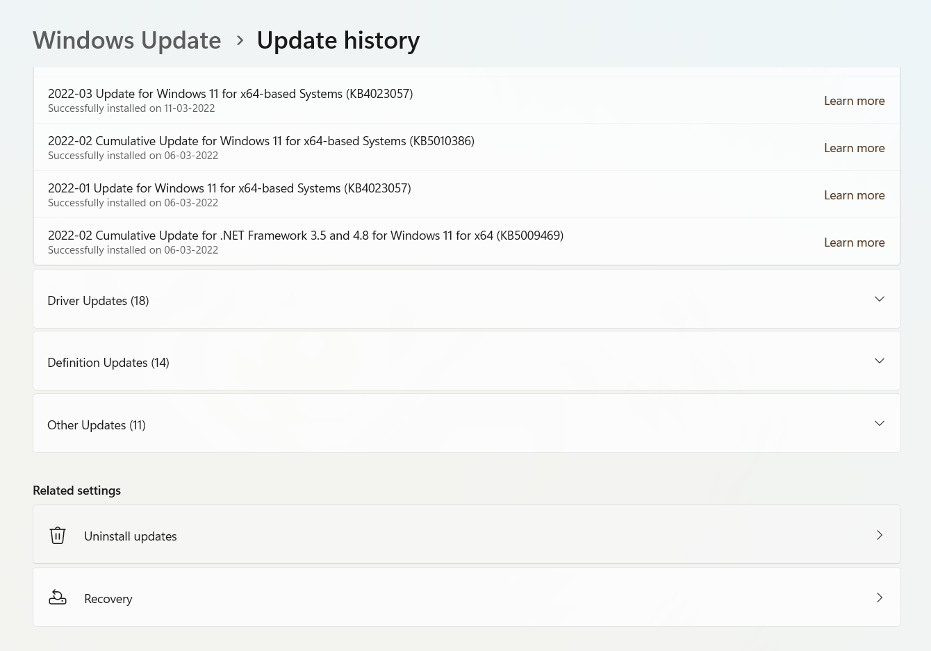- 前往Windows 更新部分在設置中並選擇更新歷史。在這裡,檢查更新日期是否與設置應用程序停止工作的時間匹配。