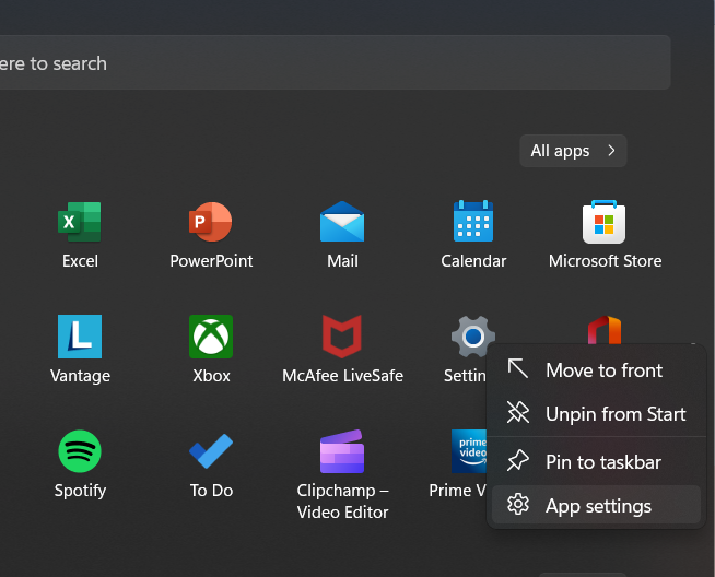 - 打開 Windows 菜單並右鍵單擊設置圖標。選擇應用程序設置。
