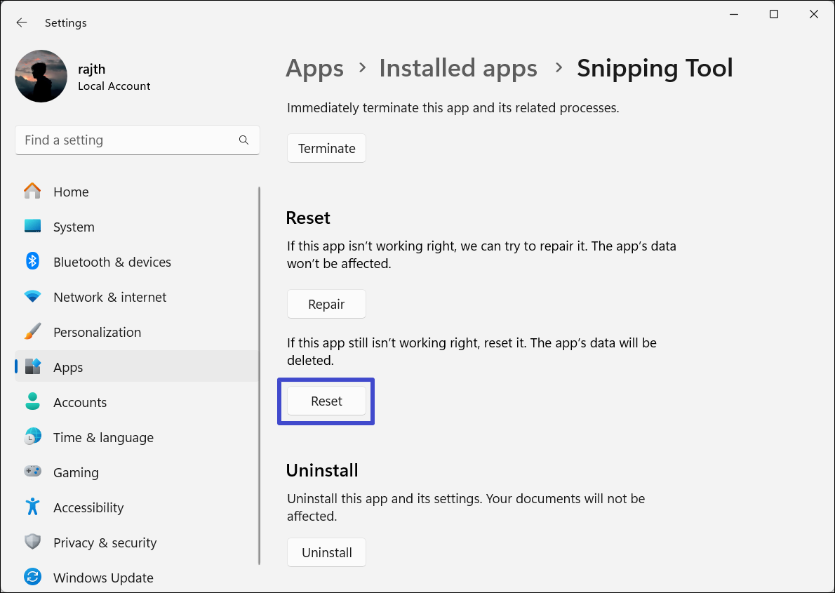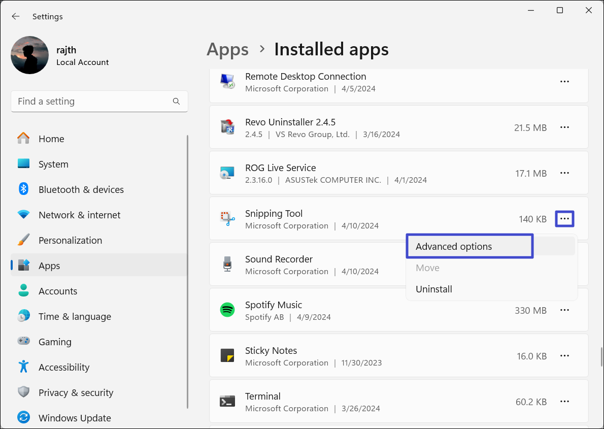2. 單擊“”旁邊的三個點截圖工具”並選擇“解除安裝”。