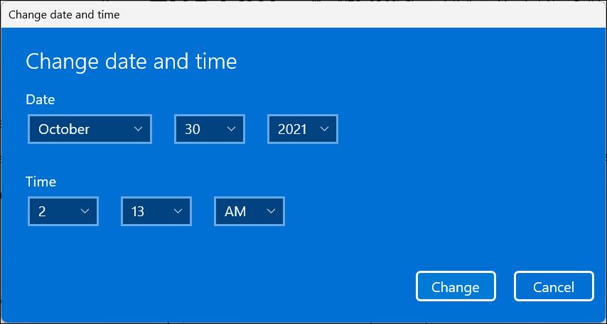 4. 在更改日期和時間彈出窗口中,將日期設置為 2021 年 10 月 30 日(或更早),並保持時間不變。然後,單擊“改變”。