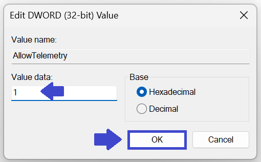 4. 雙擊允許遙測並將值設置為 1,然後單擊“確定”。