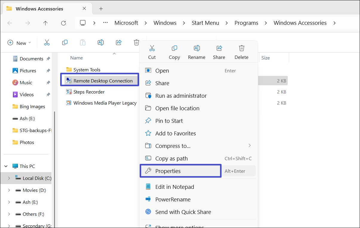 2. 右鍵單擊“遠程桌面連接” 快捷方式並選擇“特性”。