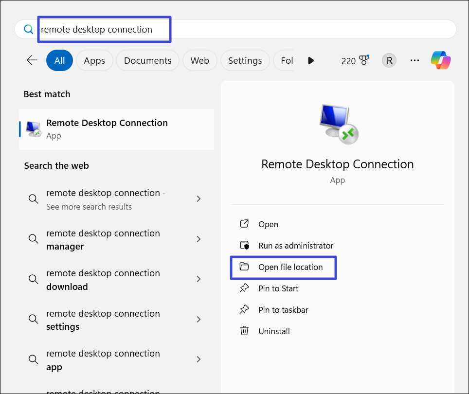 1. 搜索“遠端桌面再次在“開始”菜單中。然後選擇“打開文件位置“ 在右側。