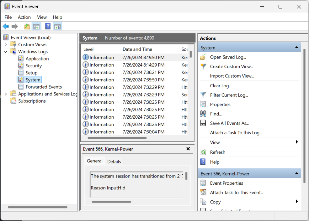 2. 在 Windows 查看器中,導航至“Windows 日誌>系統”。