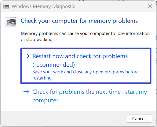 2. Windows 內存診斷工具打開後,單擊“立即重新啟動並檢查是否有問題(推薦)“ 選項。