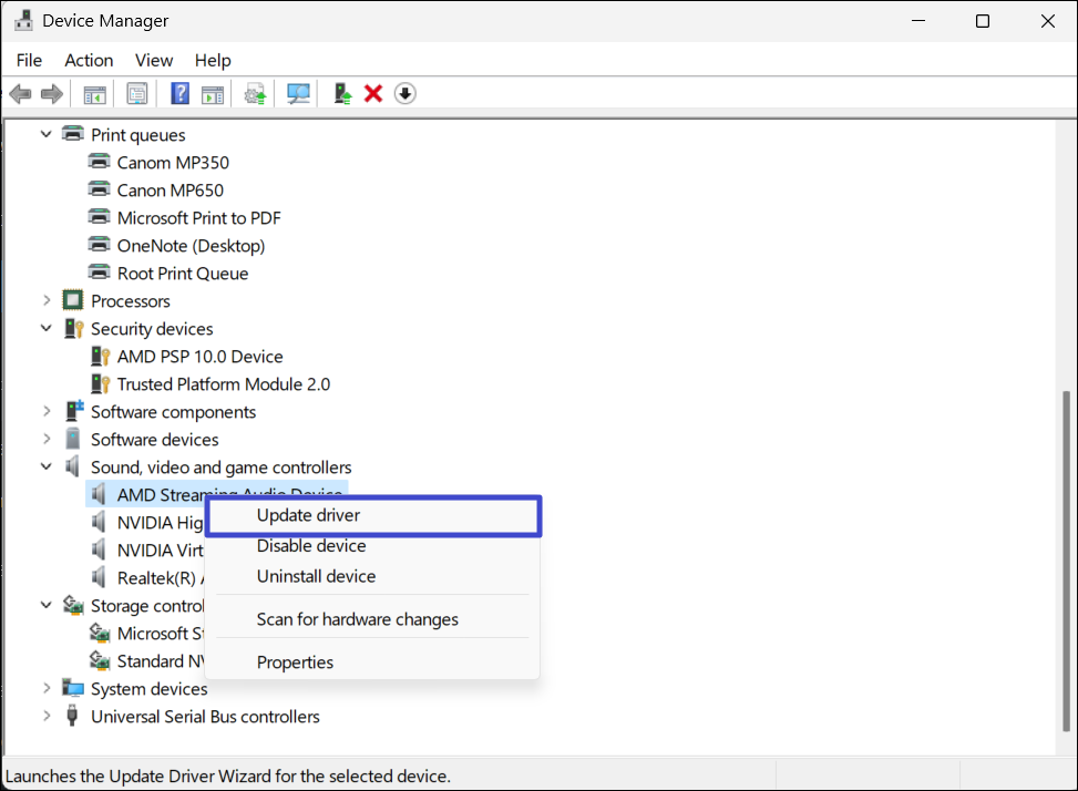 3. 然後,右鍵單擊故障設備並選擇“更新驅動程序”。
