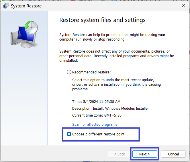 2. 在系統還原窗口中,選擇“選擇不同的還原點”,然後單擊“下一個”。