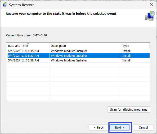 3. 從還原點列表中,選擇最舊的一個,然後單擊“下一個”。
