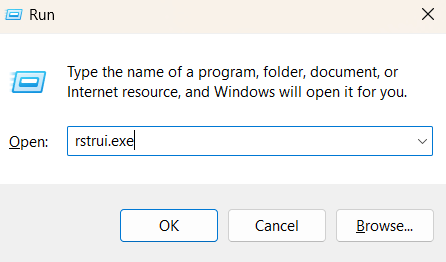 1. 按 Windows + R 打開運行命令,“rstrui.exe”並按 Enter 鍵。