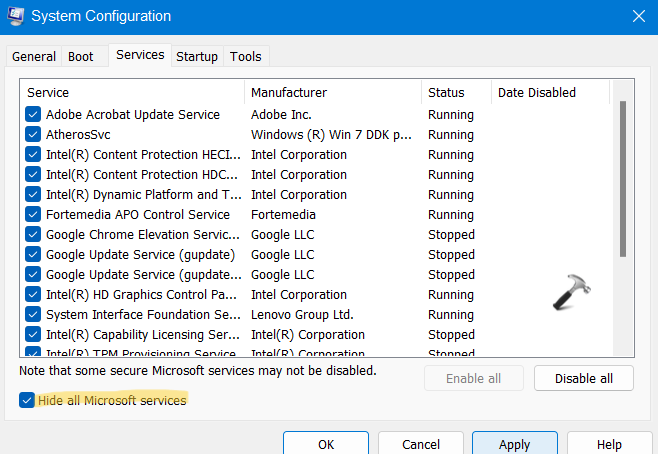 3.現在,轉到服務選項卡並選中旁邊的框隱藏所有 Microsoft 服務。之後,單擊全部禁用然後,在申請。
