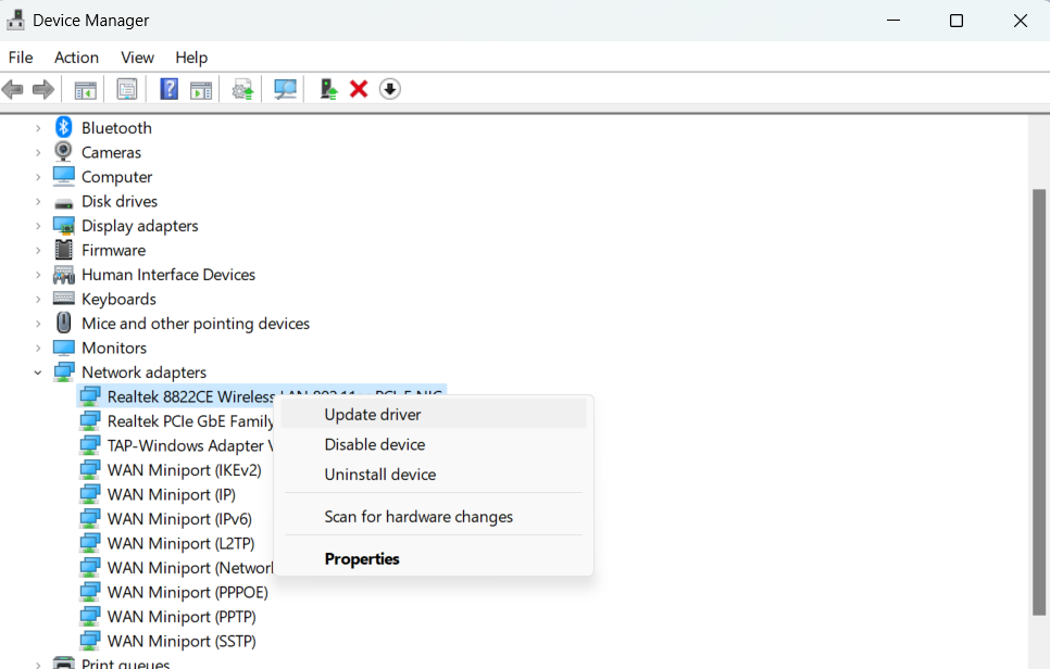 - 在連接列表中,右鍵單擊您的 Wi-Fi 設備並選擇更新驅動程序。