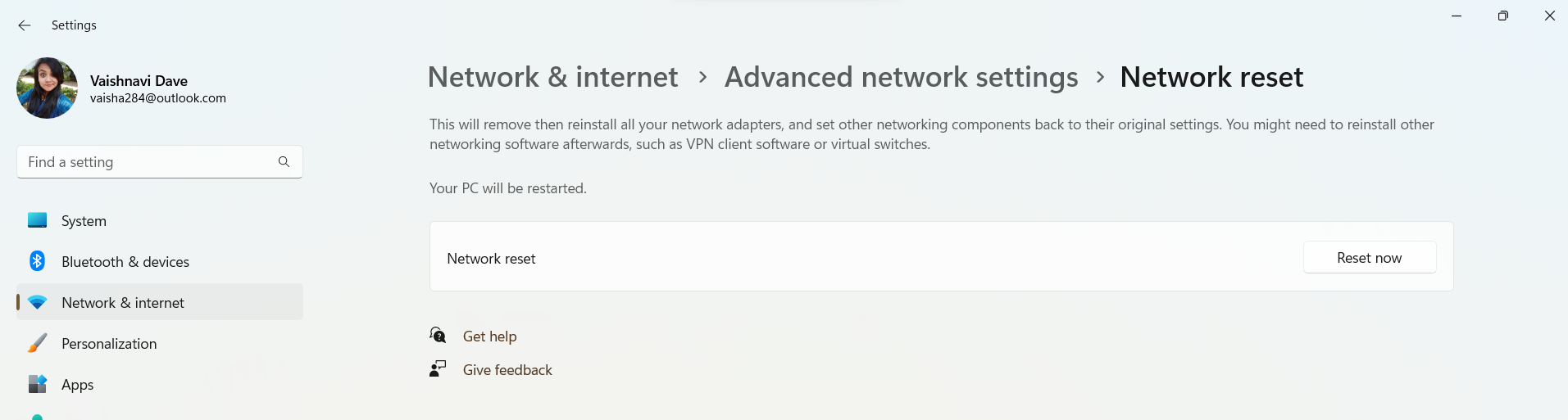 - 在這裡,單擊立即重置按鈕出現網絡重置並單擊“是”確認您的操作。