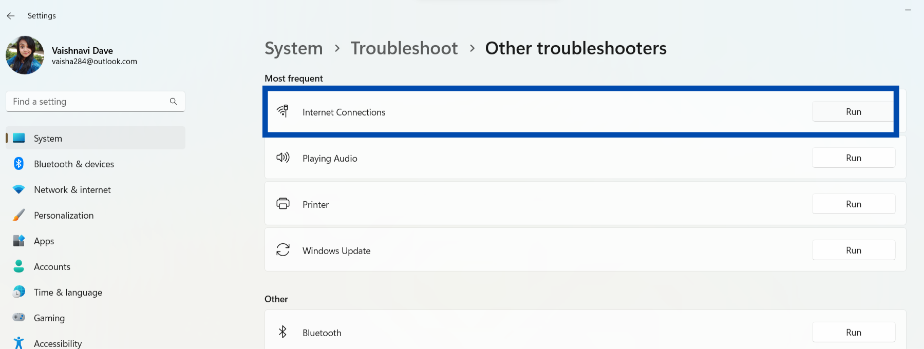 - 您將在這裡看到的第一個選項是互聯網連接。單擊出現在其中的“運行”。