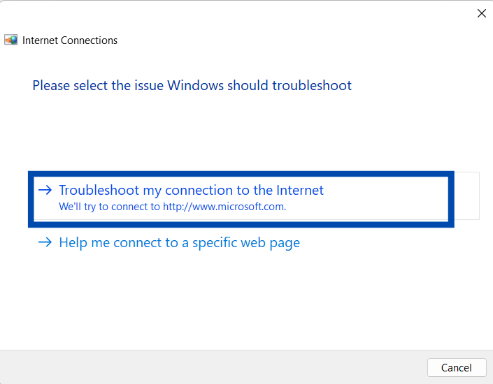 - 在打開的對話框中,選擇“排除 Internet 連接故障”。