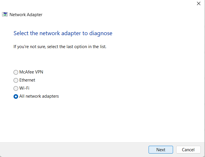在出現的窗口中,選擇所有網絡適配器,然後單擊下一步。