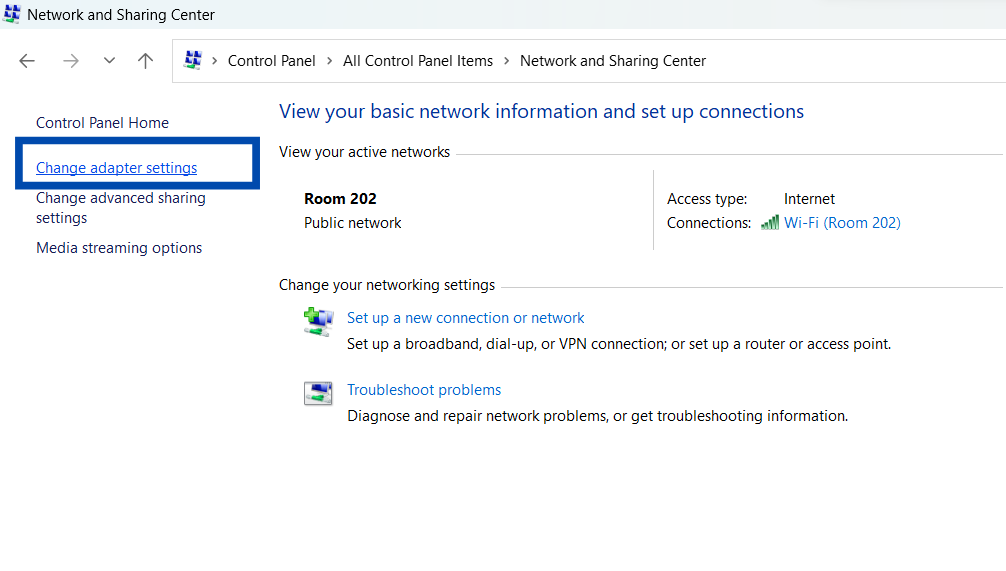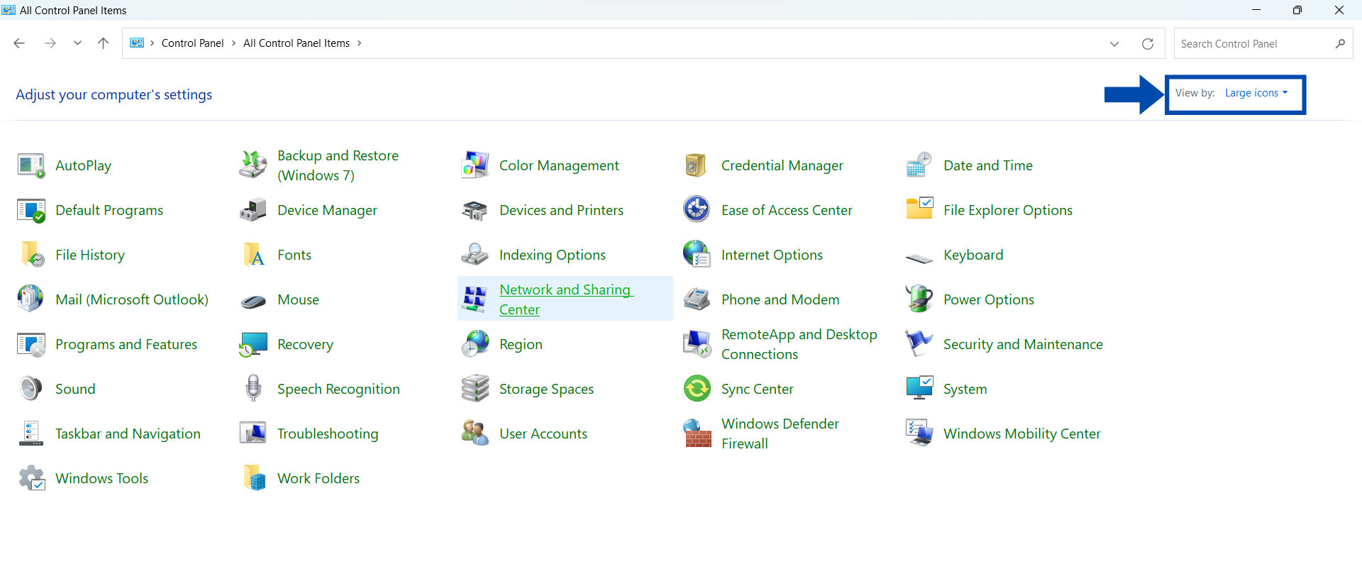 - 選擇網絡與共享中心。如果您沒有看到它,您可以更改查看方式選項大圖標或轉到網絡和 Internet > 網絡和共享中心。