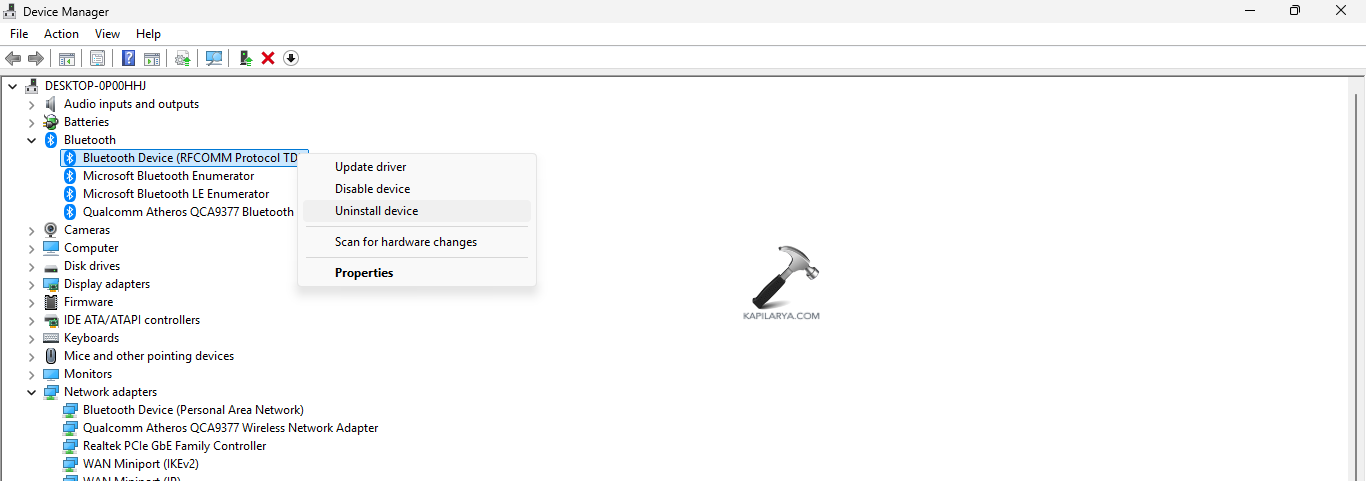 步驟2-右鍵單擊藍牙設備驅動程序,然後按卸載設備。接下來,按照屏幕上的提示進行操作。