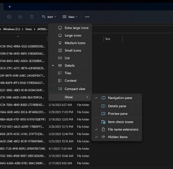 Themes 文件夾中的某些元素可能已存在,因此您可能無法全部找到它們。在這種情況下,選擇“查看>”,然後選擇“顯示”。從下拉菜單中選擇“隱藏項目”。