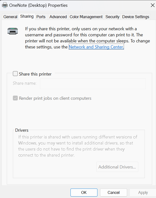 - 在分享部分,取消選中這共享這台打印機盒子。