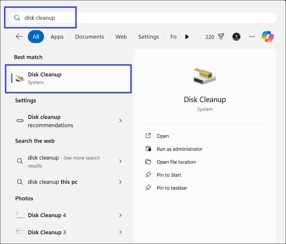 1. 打開 Windows 搜索,輸入“磁盤清理”,然後選擇頂部結果。