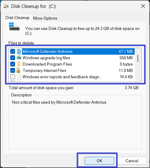 5. 選擇要清除的不需要的文件,例如下載文件夾、回收站、緩存、臨時文件等,然後單擊“好的”。