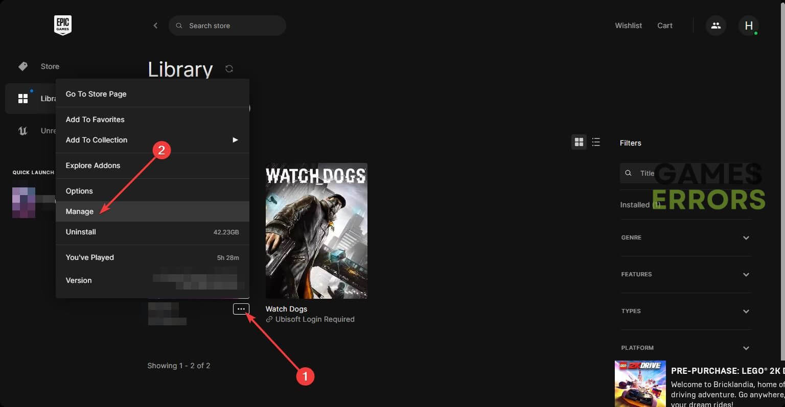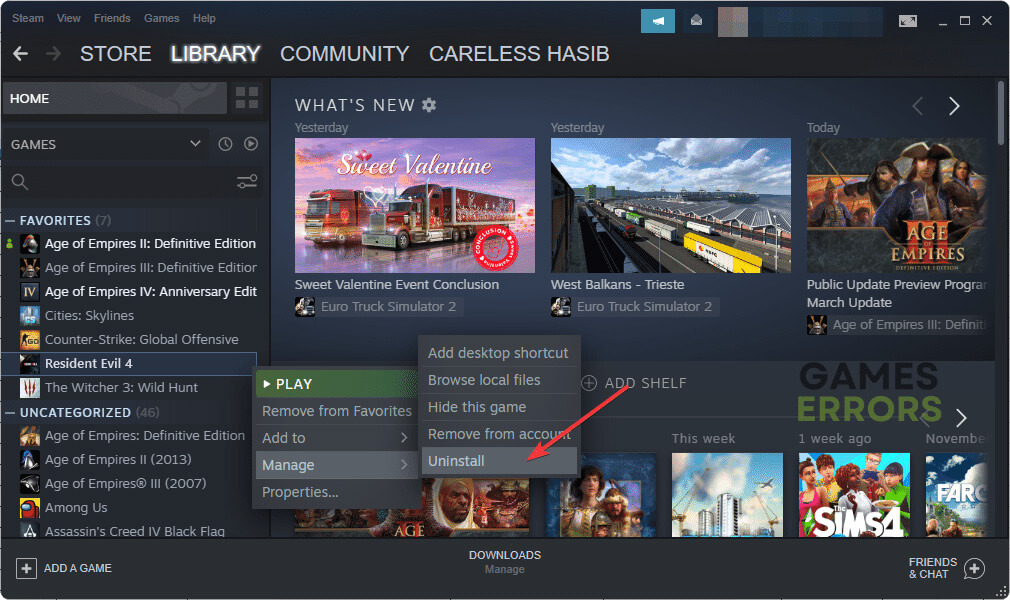 - 右鍵單擊有問題的遊戲,將鼠標光標懸停在管理,然後單擊解除安裝。