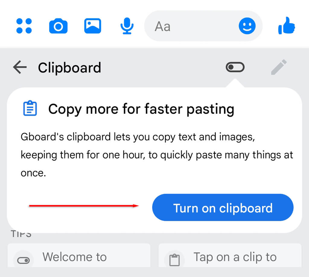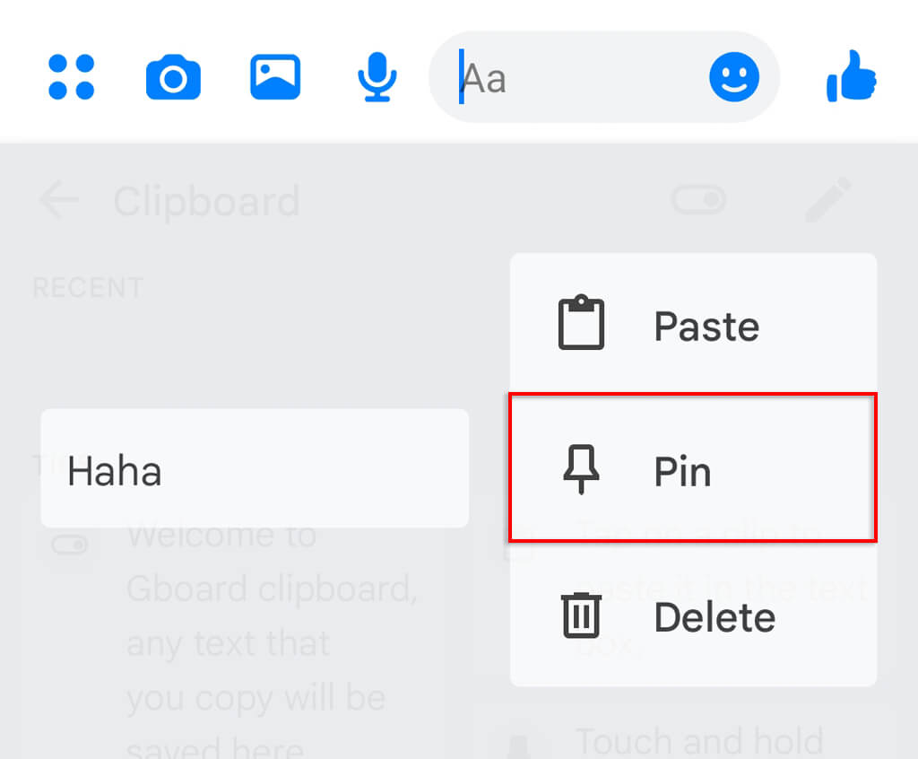 筆記:您可以通過固定剪貼板項目將其永久保存在 Gboard 剪貼板中。要固定某個項目,請點擊並按住它,然後按別針。