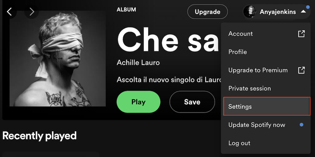 - 在您的個人資料圖片下和Spotify 用戶名,選擇向下箭頭打開菜單。