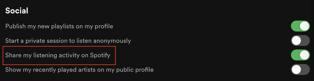 現在您可以在屏幕右側看到您朋友的收聽活動。如果您還想與他們分享您的收聽活動,請返回 Spotify 菜單並按照路徑操作設定>社會的>在 Spotify 上分享我的聆聽活動。