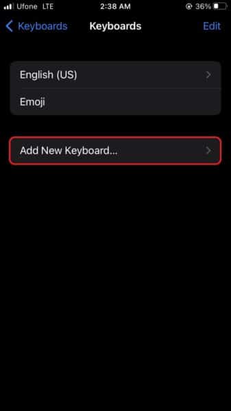 - 在這裡,您將看到 iPhone 上當前啟用的鍵盤列表。要向鍵盤添加新語言,請點擊添加新鍵盤。