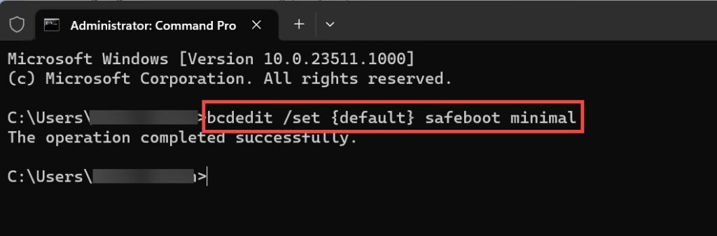 2.在命令提示符中,鍵入“bcdedit /set {default} safeboot 最小”,然後按 Enter 鍵以使用最少的實用程序啟用安全啟動。等待“操作成功完成”消息
