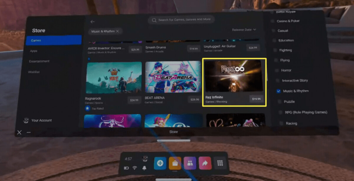 快速進入遊戲的最直接方法是通過 Oculus Quest 耳機購買。您可以通過按右觸摸控制器上的 Oculus 按鈕來訪問虛擬現實中的店面。只需打開工具欄並選擇商店圖標即可。