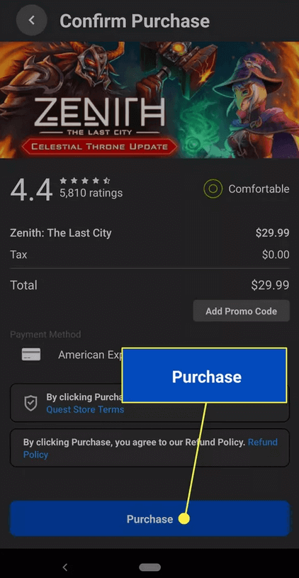移動應用程序將通過您的默認付款方式收費,就像您從 VR 購買一樣。您將在 Quest 庫中找到新遊戲,但如果您通過移動應用購買了該遊戲,則下次打開 Oculus 耳機時,該遊戲將會下載到您的 Oculus 耳機上。這意味著您必須等待下載完成才能開始玩。