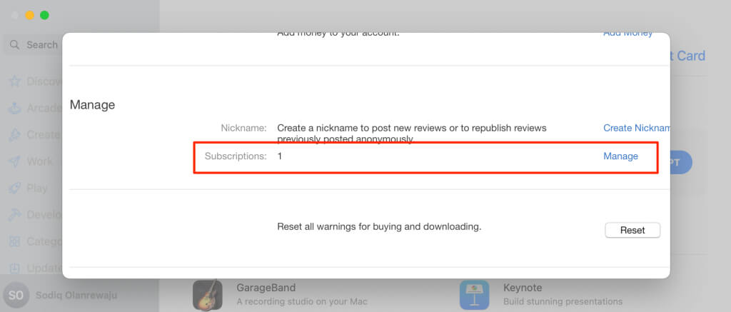 - 向下滾動到“管理”部分並選擇管理在“訂閱”旁邊。