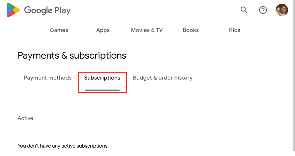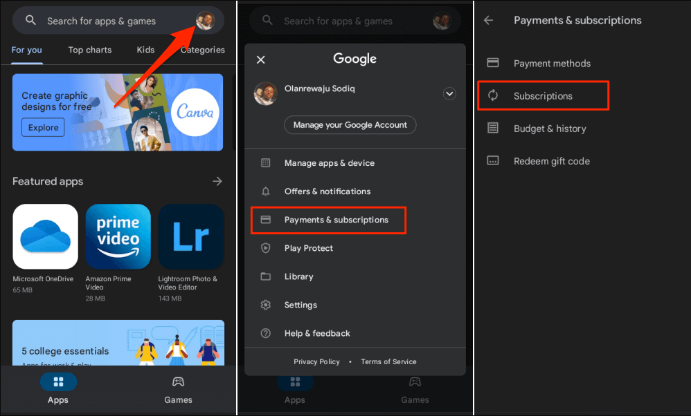 - 打開Play 商店應用程序並選擇您的個人資料圖片在右上角。
