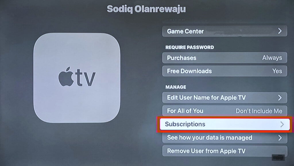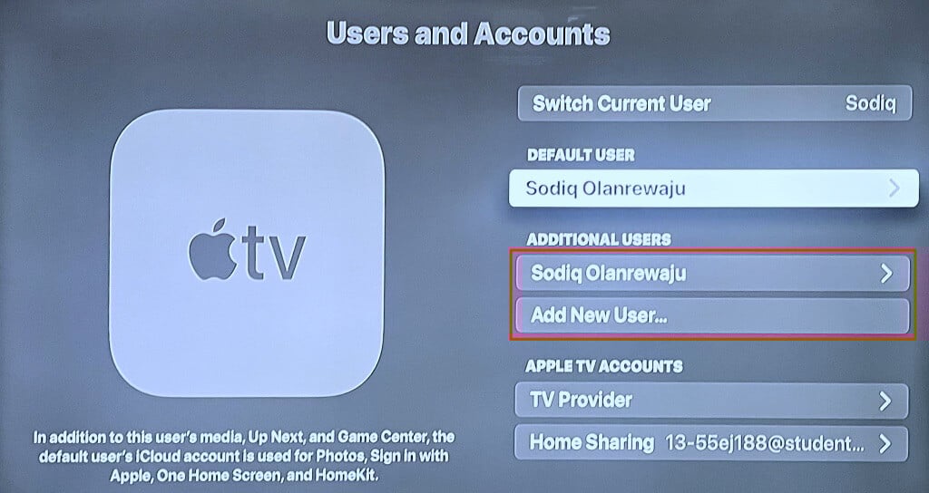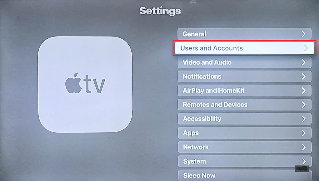 - 打開你的蘋果電視設定應用程序並選擇用戶及賬戶。