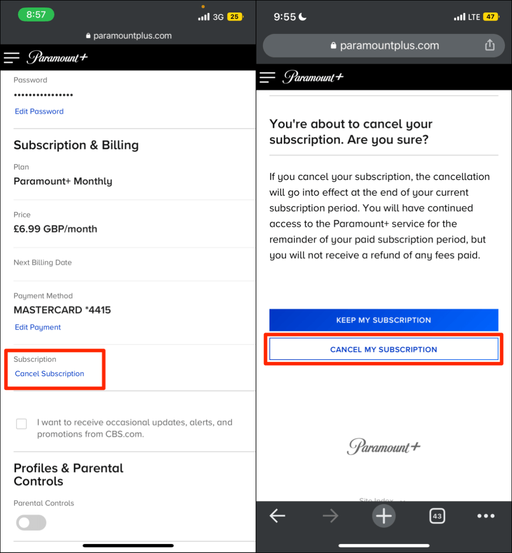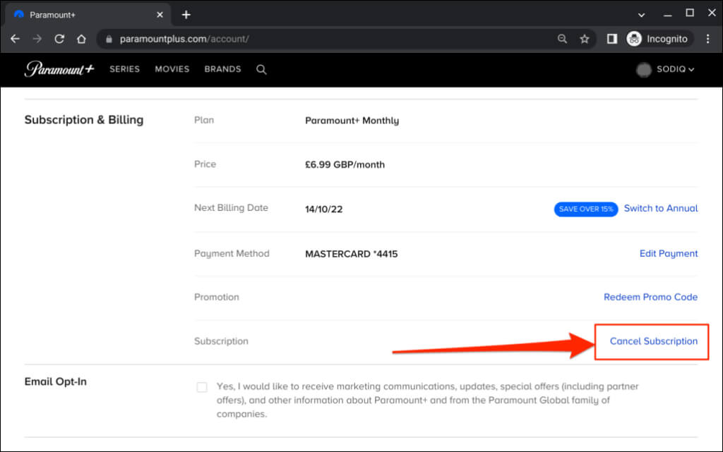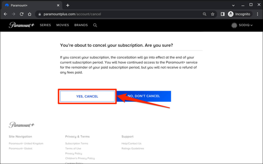 您還可以通過網絡瀏覽器取消您的 Paramount+ 訂閱。參觀,前往訂閱選項卡,然後選擇派拉蒙 Plus。選擇取消訂閱並按照提示結束訂閱。