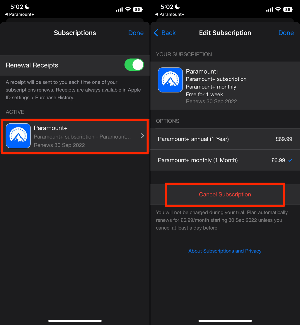 通過 Apple ID 設置取消 Paramount Plus 訂閱