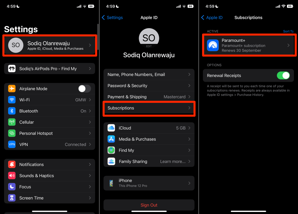 如果您使用其他 Apple ID 購買了訂閱,則在派拉蒙應用程序中找不到“manageSubscription”選項。