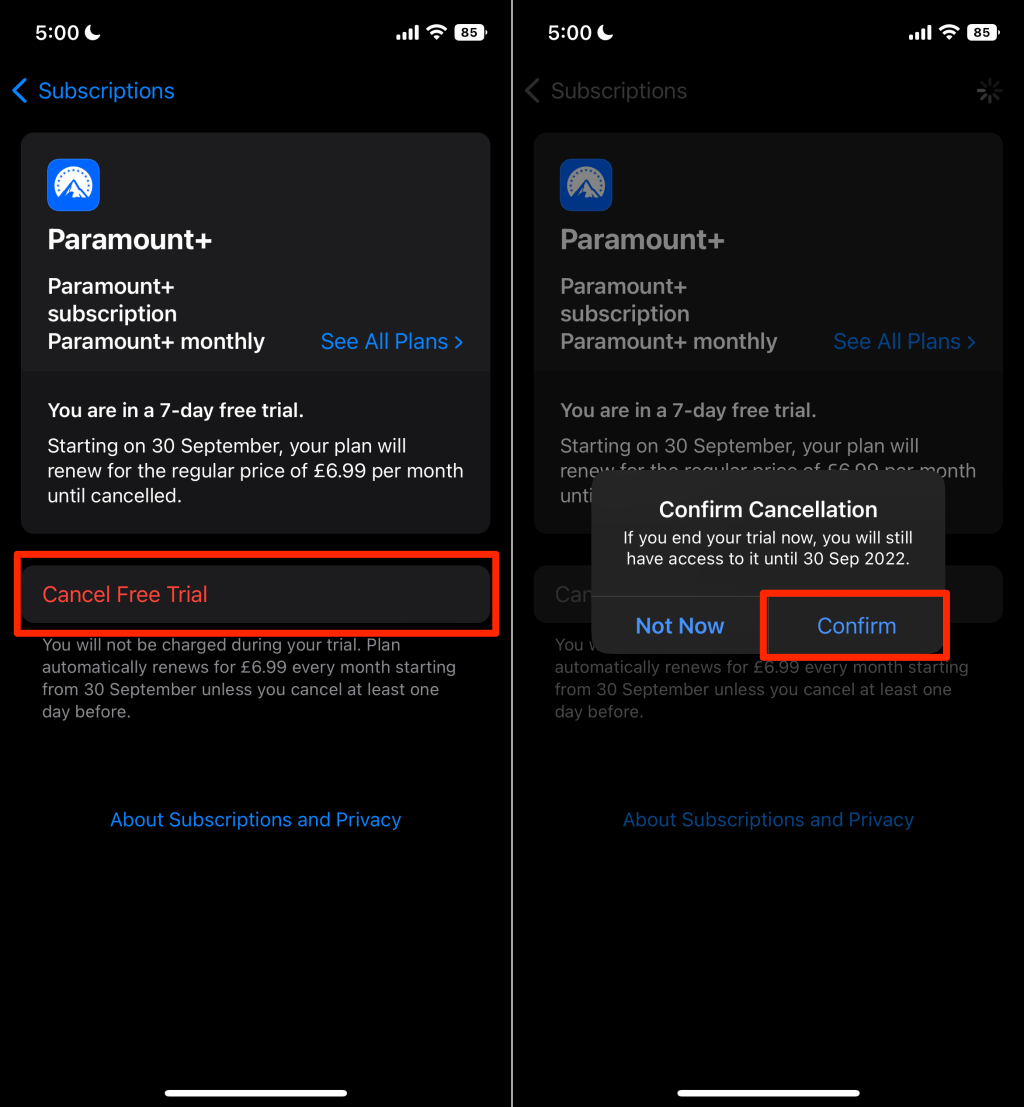 - 輕敲取消訂閱(或者取消免費試用)並選擇確認取消訂閱。