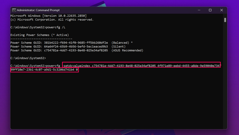 powercfg -setdcvalueindex c754781e-4dd7-4193-8e48-025e34af8205 4f971e89-eebd-4455-a8de-9e59040e7347 99ff10e7-23b1-4c07-a9d1-5c3206d741b4 0