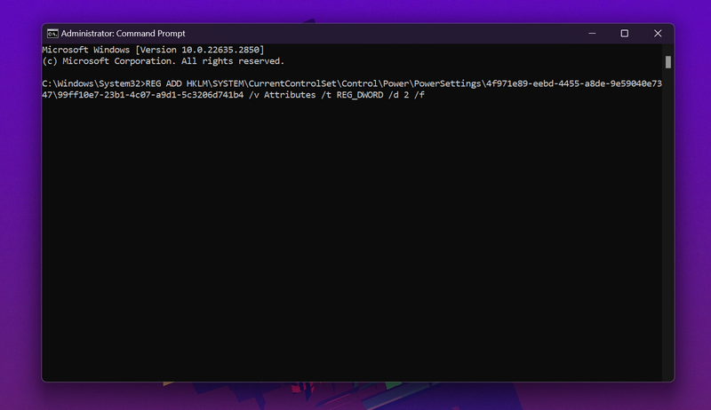 REG ADD HKLMSYSTEMCurrentControlSetControlPowerPowerSettings4f971e89-eebd-4455-a8de-9e59040e734799ff10e7-23b1-4c07-a9d1-5c3206d741b4 /v Attributes /t REG_DWORD /d 2 /f
