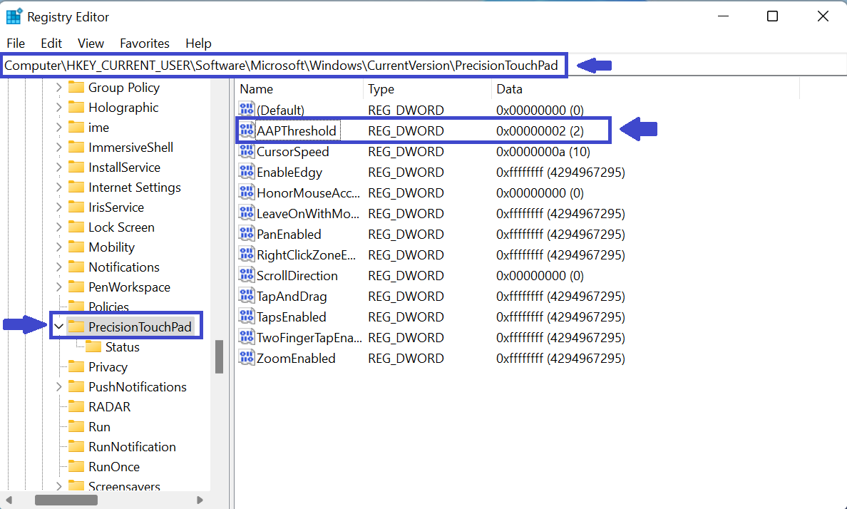 ComputerHKEY_CURRENT_USERSoftwareMicrosoftWindowsCurrentVersionPrecisionTouchPad
