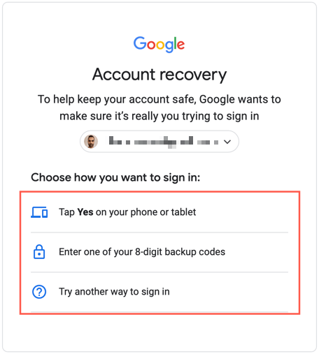 - 備份代碼:使用為 Google 帳戶設置兩步驗證時提供的八個備用代碼之一。
