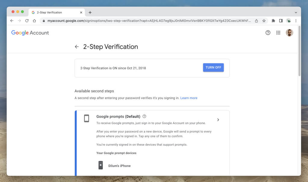 兩步驗證為您的帳戶增加了一層額外的安全保護,要求您在訪問帳戶之前點擊提示或使用發送到您的移動設備的代碼。您還可以將兩步驗證鏈接到谷歌身份驗證器。